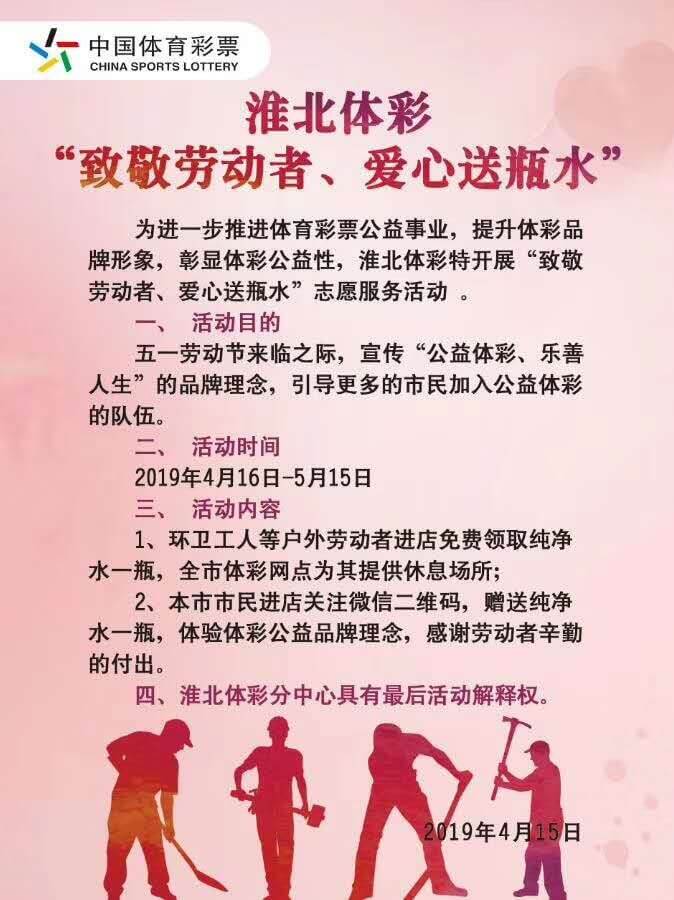 公益体彩乐善人生,中国体育彩票作为国家公益彩票,肩负着促进公益事业的发展,淮北体彩“致敬劳动者,爱心送瓶水”志愿活动,用实际的行动践行建设“负责任、可信赖、健康可持续发展的国家公益彩票。
