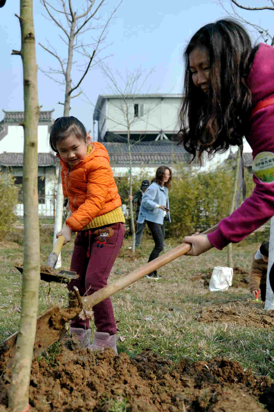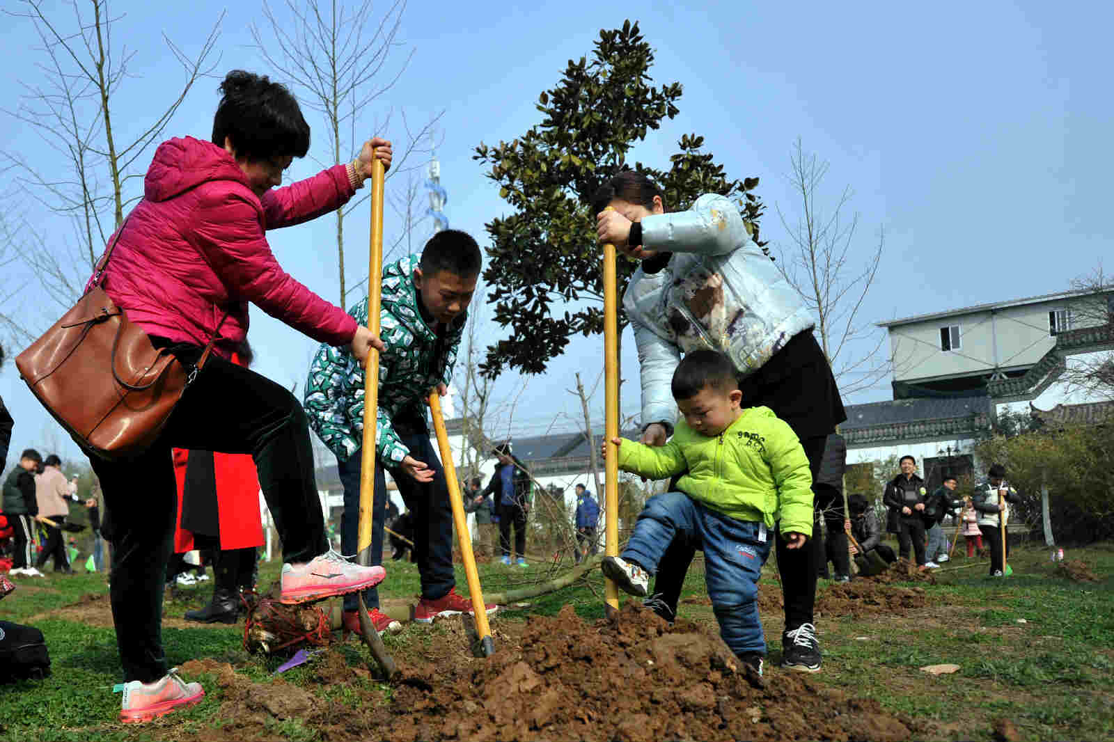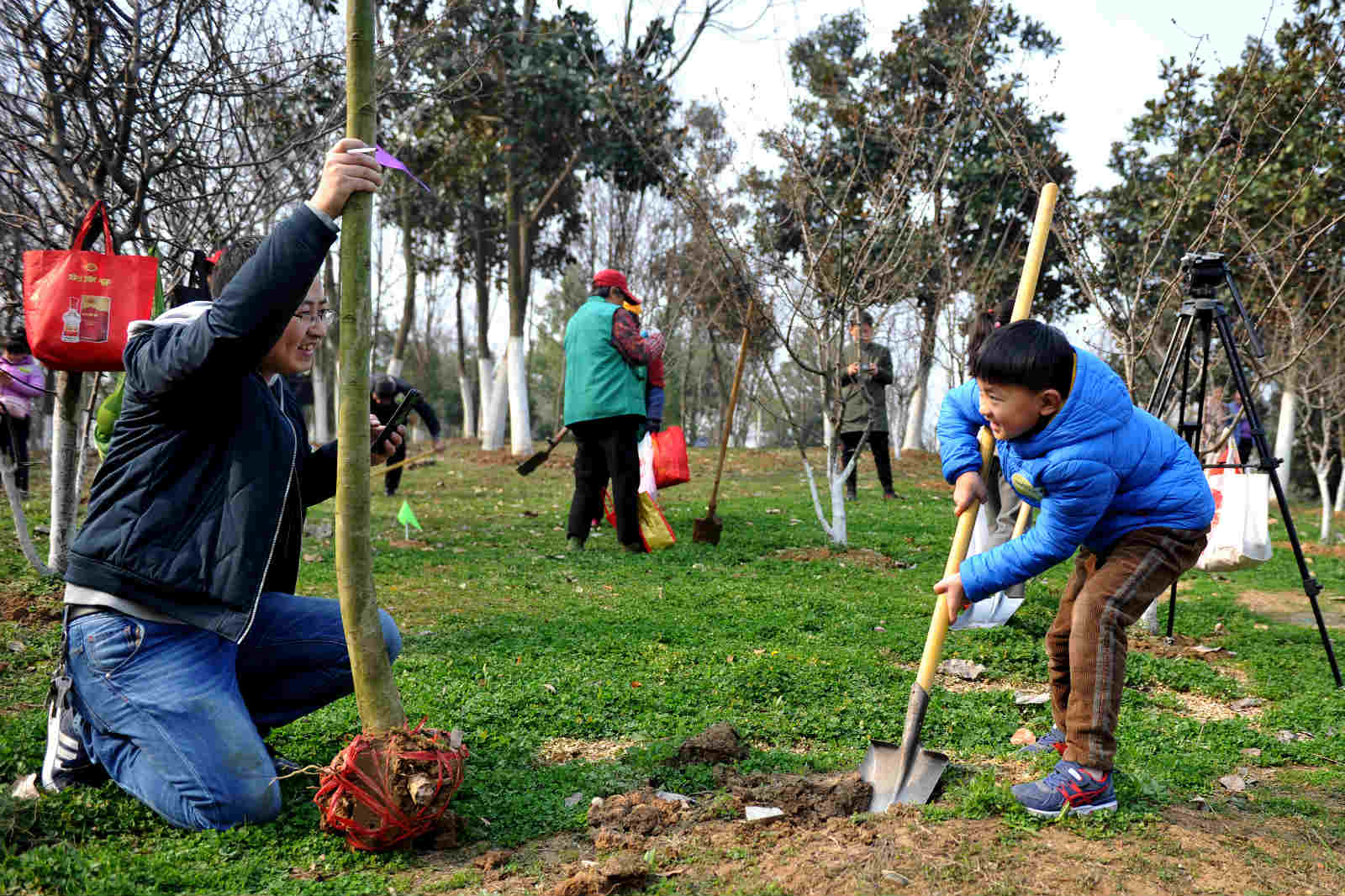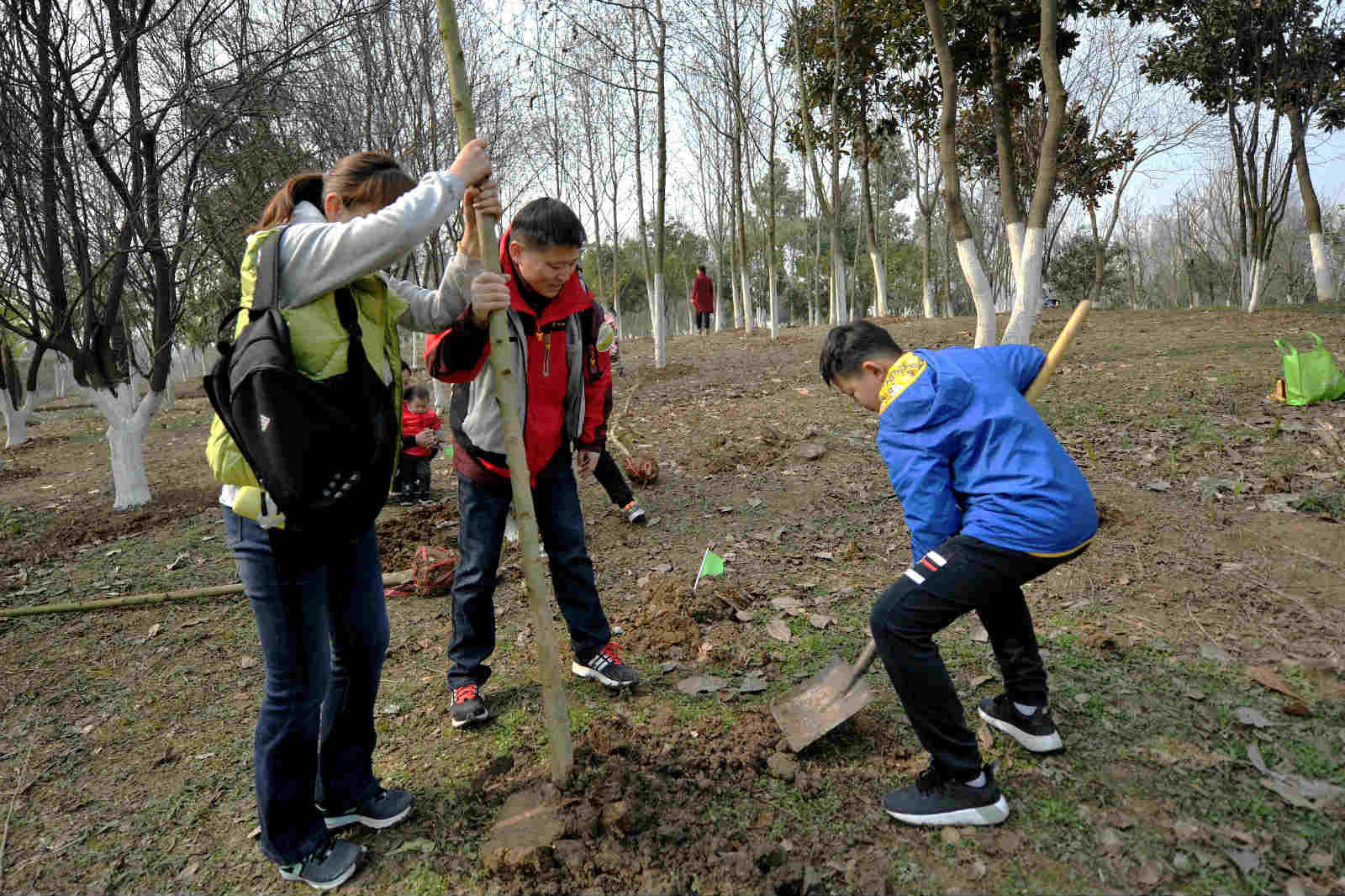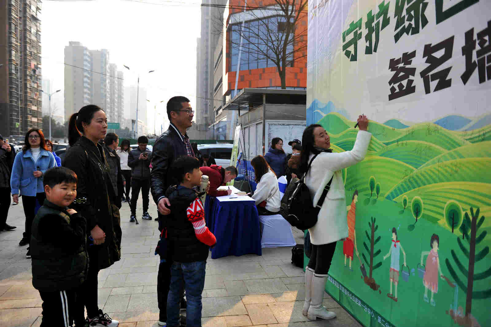 现场参加活动的市民很多是和自己的孩子一起,挖坑、铲土、浇水,栽上树苗,尽管鞋上沾满泥土,额头布满汗水,但孩子们脸上都挂着笑容,心里面也一定播下了绿色的希望。